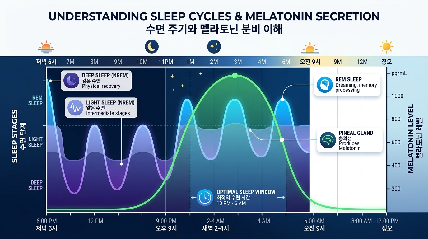수면 과학에서 핵심 체온 하강은 수면 진입의 가장 중요한 생리적 신호입니다. 뇌 온도가 약 1도 낮아지면 수면 유도 호르몬인 멜라토닌 분비가 급격히 증가합니다.