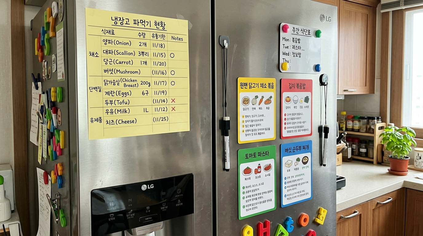 냉장고 재고 가시화 시스템: 냉장고 문에 현재 재고 목록을 작성한 포스트잇을 붙여두세요. 퇴근 후 냉장고를 열기 전에 이미 무엇이 있는지 파악할 수 있어 요리 결정 속도가 빨라집니다.