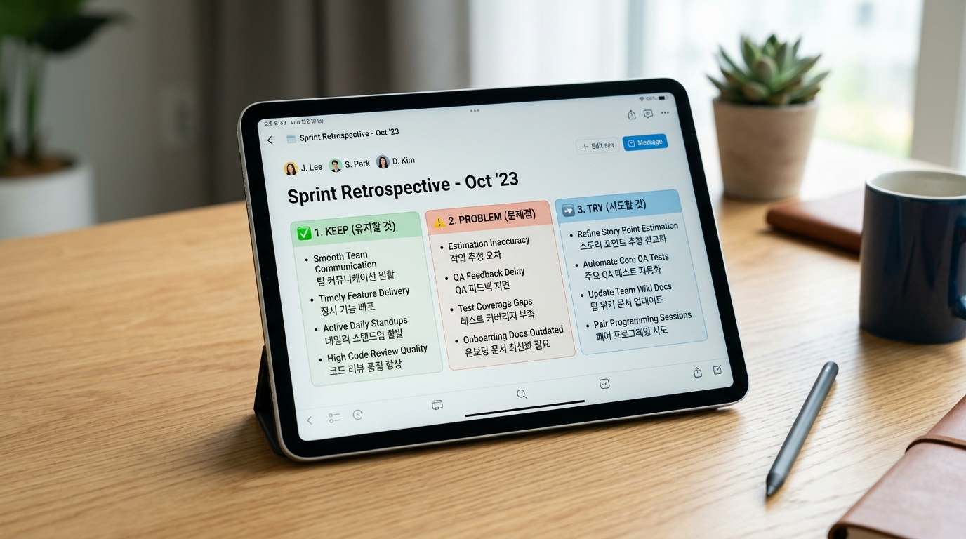연휴 마지막 날 저녁, 기업에서 사용하는 KPT 회고 시스템으로 7일간의 성과를 객관적으로 측정하세요.