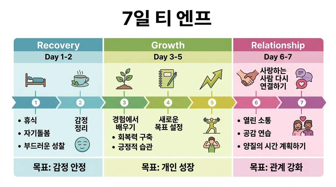 매일 저녁 5분간 오늘의 성취를 기록하고 내일의 핵심 행동 하나를 미리 결정해두세요. 이 작은 루틴이 7일 플랜 전체의 일관성을 유지하는 핵심 장치입니다.