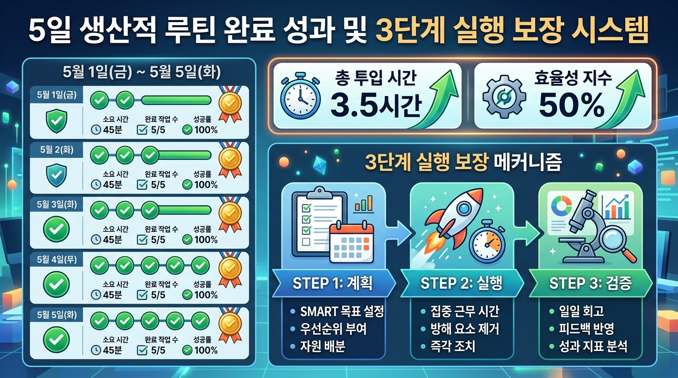효율성 지수 분석: 3.5시간(고밀도 작업) ÷ 7시간(평상시 분산 작업) = 50% 시간 최적화 달성