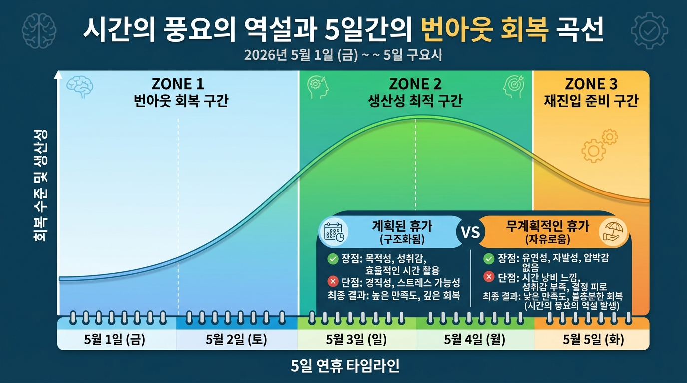 황금연휴 5일은 직장인에게 주어지는 가장 전략적인 시간 자산입니다. 그러나 시간 여유의 역설로 인해, 연휴가 길어질수록 실행력이 오히려 저하되는 구조적 문제가 발생합니다. 파킨슨의 법칙에 따르면 "업무는 주어진 시간을 모두 소진할 때까지 확장된다"는 원리가 연휴에도 동일하게 적용됩니다. 이번 글에서는 행동경제학과 긍정 심리학을 기반으로, 5일 연휴를 번아웃 회복과 자기계발로 완벽하게 최적화하는 5단계 갓생 시스템을 분석합니다.