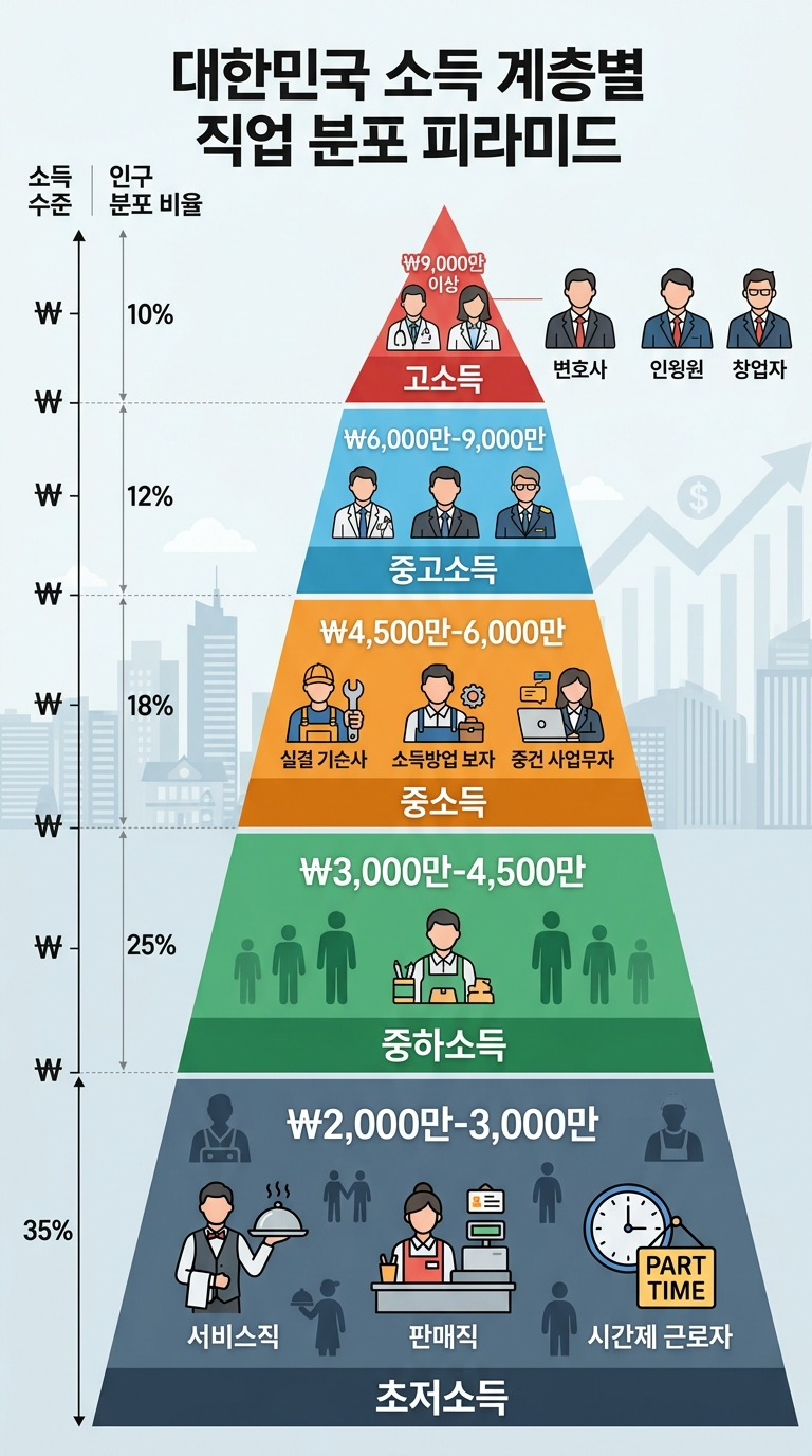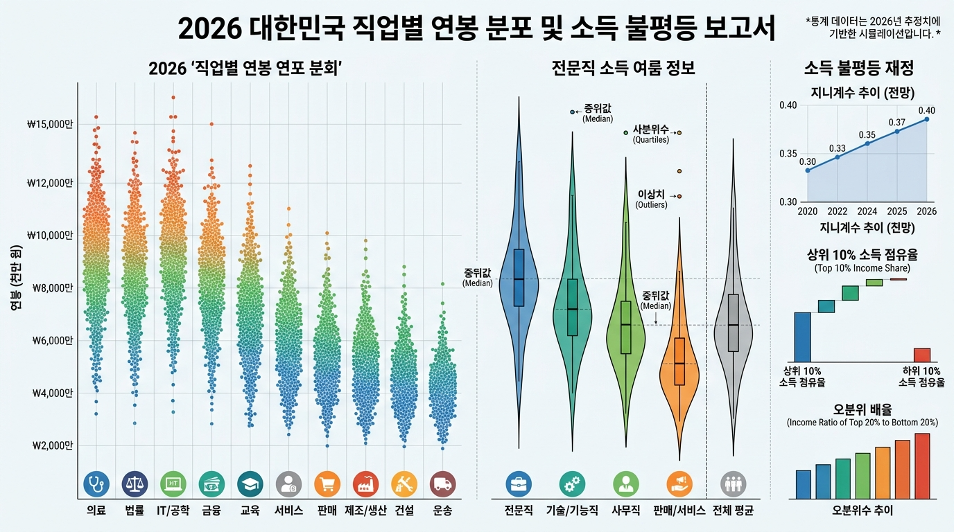 2026년 현재 대한민국의 직업 간 소득 격차가 역대 최대 수준으로 벌어지고 있습니다. 통계청 고용노동부 자료에 따르면 상위 10% 직종과 하위 10% 직종의 연봉 차이가 무려 6배에 달하는 것으로 나타났습니다. 본 포스팅에서는 2026년 최신 데이터를 기반으로 최저임금 수준의 직업부터 연봉 1억 이상의 고소득 직업까지, 대한민국 직업별 소득 구조를 체계적으로 분석합니다.