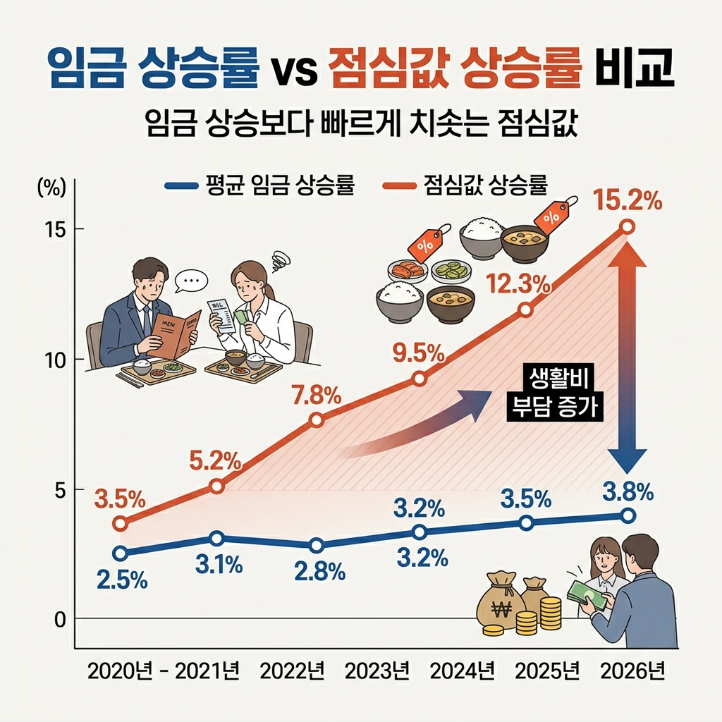 2026년 현재 외식 물가 상승률이 전년 대비 8.3%를 기록하며, 직장인들의 점심 한 끼 평균 비용이 15,000원을 돌파했습니다. 이른바 '런치플레이션(Lunchflation)'이라 불리는 이 현상은 단순한 물가 상승을 넘어 직장인 가계의 구조적 위기를 야기하고 있습니다. 본 포스팅에서는 런치플레이션의 실태를 데이터로 분석하고, 세 가지 핵심 절약 전략의 ROI를 정밀하게 계산해 최적의 식비 절감 시스템을 제시합니다.
