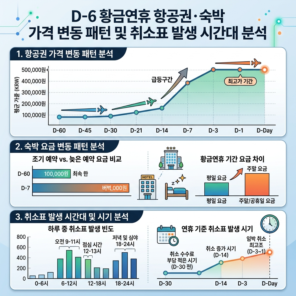 D-6는 황금연휴 여행의 마지막 기회이자 최고의 기회입니다. 동적 가격제 알고리즘을 이해하고 취소표 발생 패턴을 활용하면, 늦은 예약이 오히려 더 유리한 결과를 만들어낼 수 있습니다.