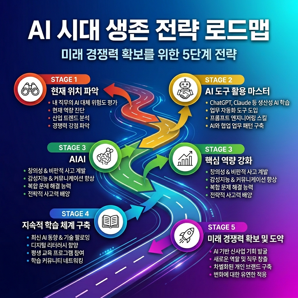 AI 시대의 생존 공식은 명확합니다. AI와 경쟁하는 것이 아니라 AI를 도구로 활용하는 전문가가 되는 것입니다. 지금 당장 자신의 직업 위험도를 파악하고 체계적인 역량 강화에 나서는 것이 2026년 직장인의 가장 현명한 선택입니다.