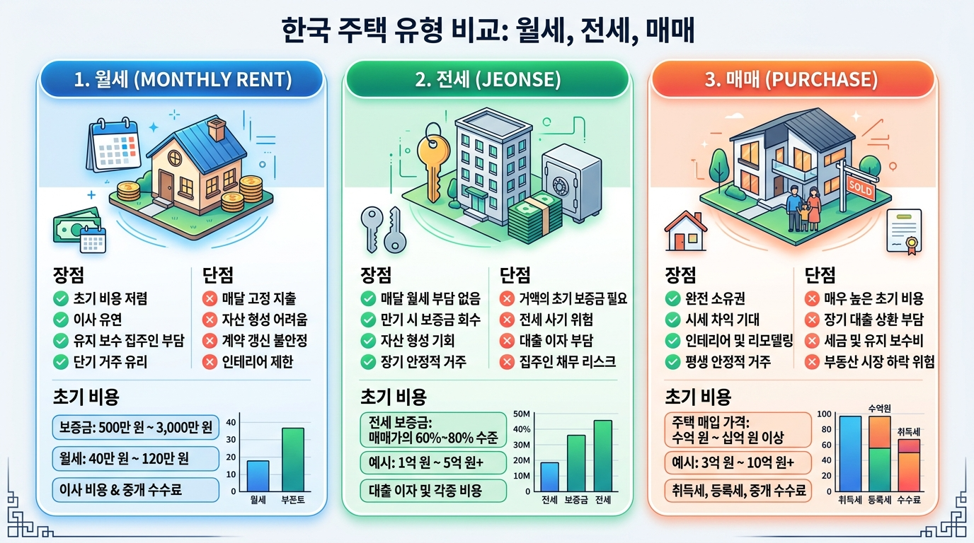 2026년 부동산 시장은 고금리 장기화, 전세 사기 여파, 지역별 양극화라는 세 가지 키워드로 요약됩니다. 이러한 복잡한 시장 환경에서 월세, 전세, 매매 중 어떤 주거 형태를 선택하느냐는 단순한 주거 문제를 넘어 개인의 자산 형성 전략 전체에 영향을 미치는 중요한 재무적 결정입니다.