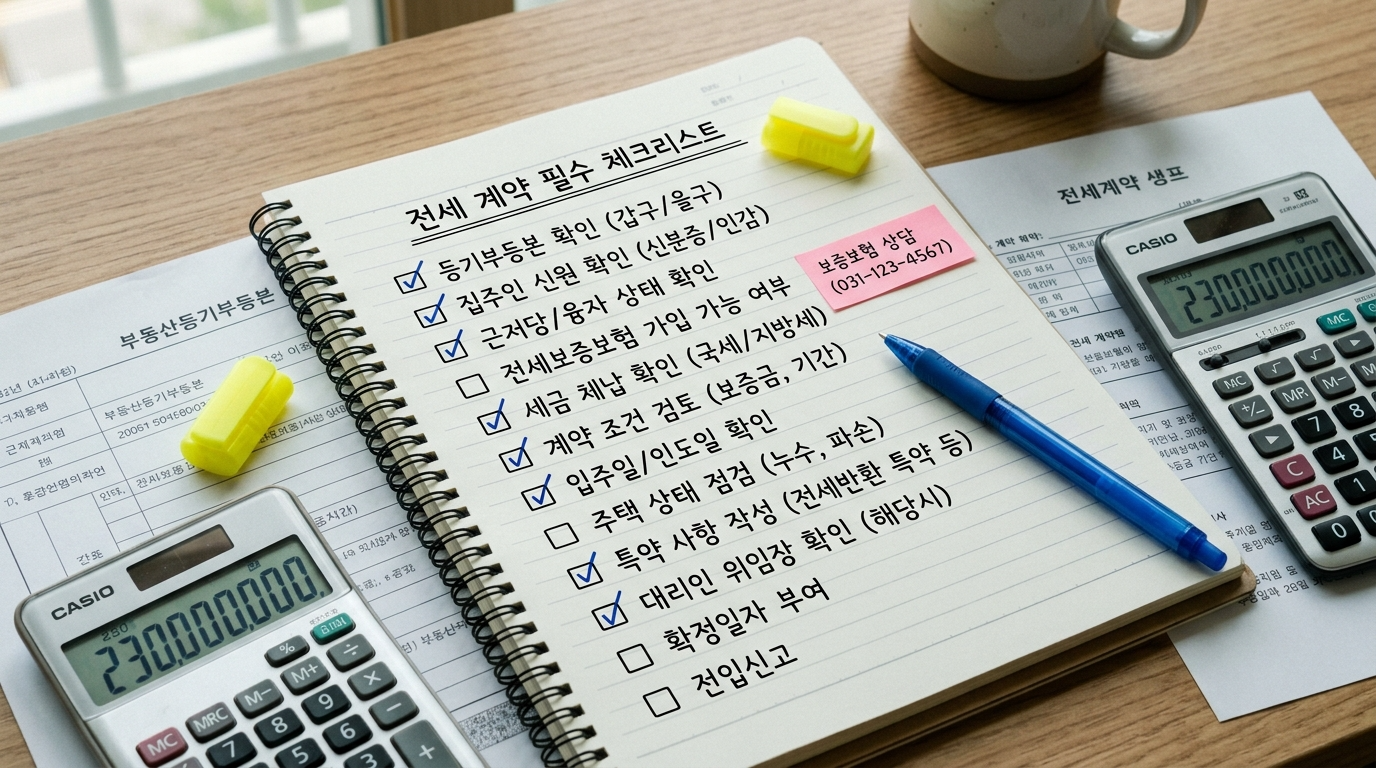 전세 선택 시 반드시 갖춰야 할 안전장치는 다음과 같습니다. 전세보증보험 가입은 절대적 필수 요건입니다. 계약 전 등기부등본 확인으로 선순위 근저당 설정 여부를 파악하고, 집주인의 세금 체납 여부를 국세청 홈택스에서 직접 확인하세요. 깡통전세 위험을 피하기 위해 전세가율이 70%를 초과하는 물건은 피하는 것이 원칙입니다.