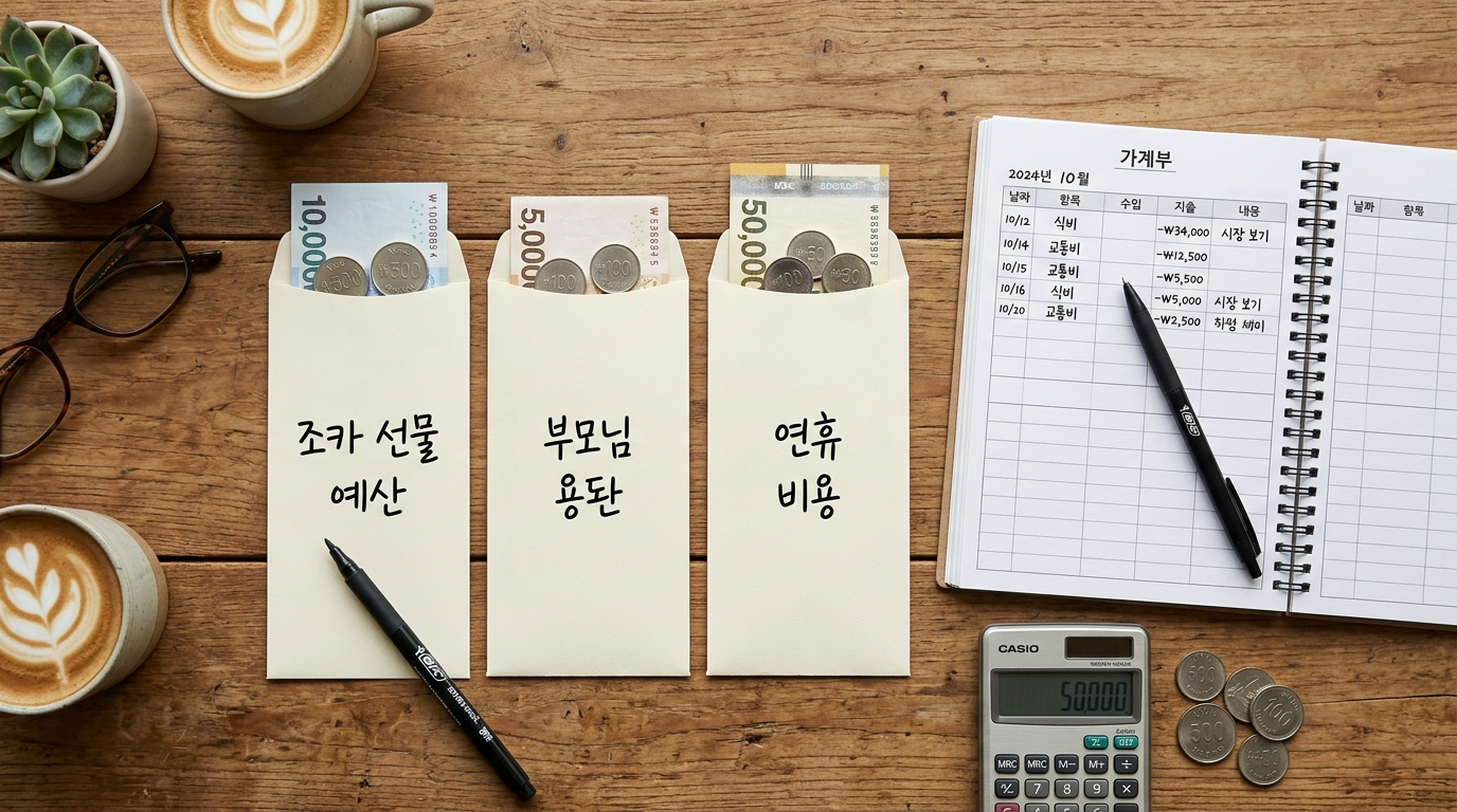 지출이 발생하기 전에 항목별 예산을 봉투에 나눠 담아두는 것이 가장 강력한 방어 수단입니다. 물리적으로 나눠두면 초과 지출을 원천 차단할 수 있습니다. - 2단계 (5월 1일~8일): 카드 사용 최소화