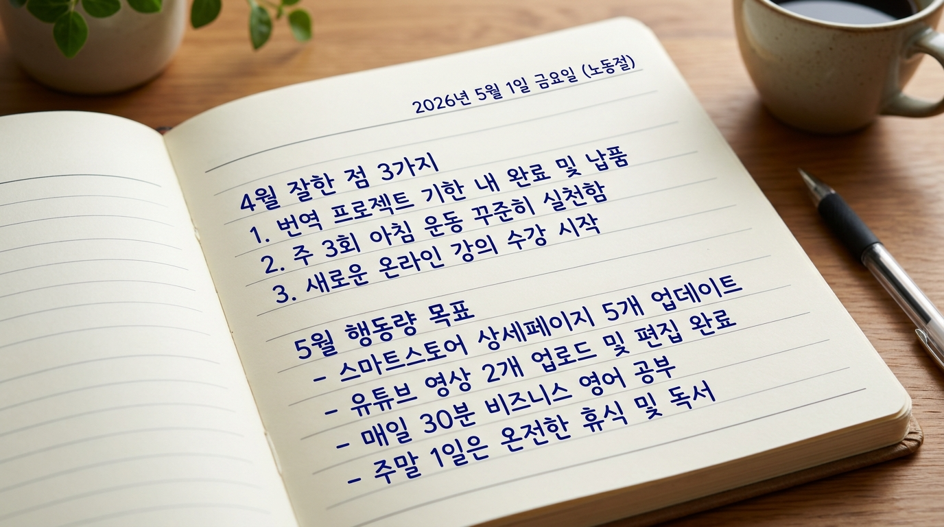 모든 것을 한꺼번에 바꾸려 하지 마세요. 이번 달 가장 아쉬웠던 것 하나만 골라서 5월에 집중적으로 개선해보세요.