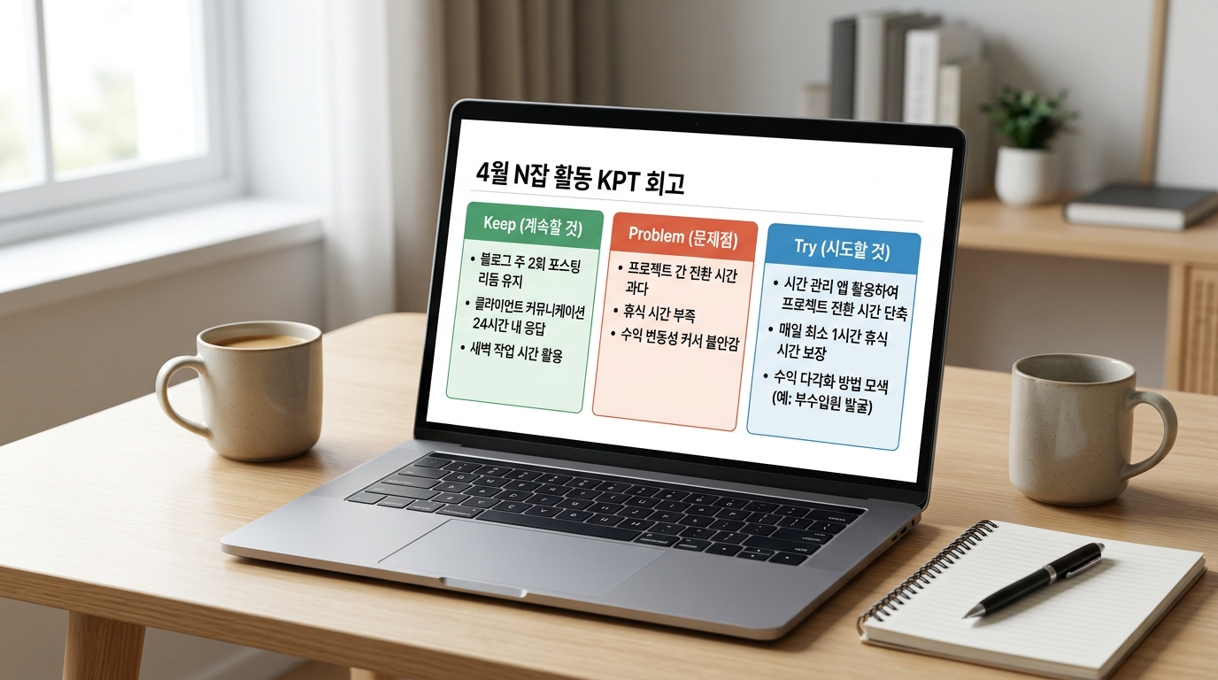 수익이 아닌 나의 시스템을 점검하기 위해 기업에서 사용하는 KPT 회고 기법을 개인의 N잡에 적용해봅시다.